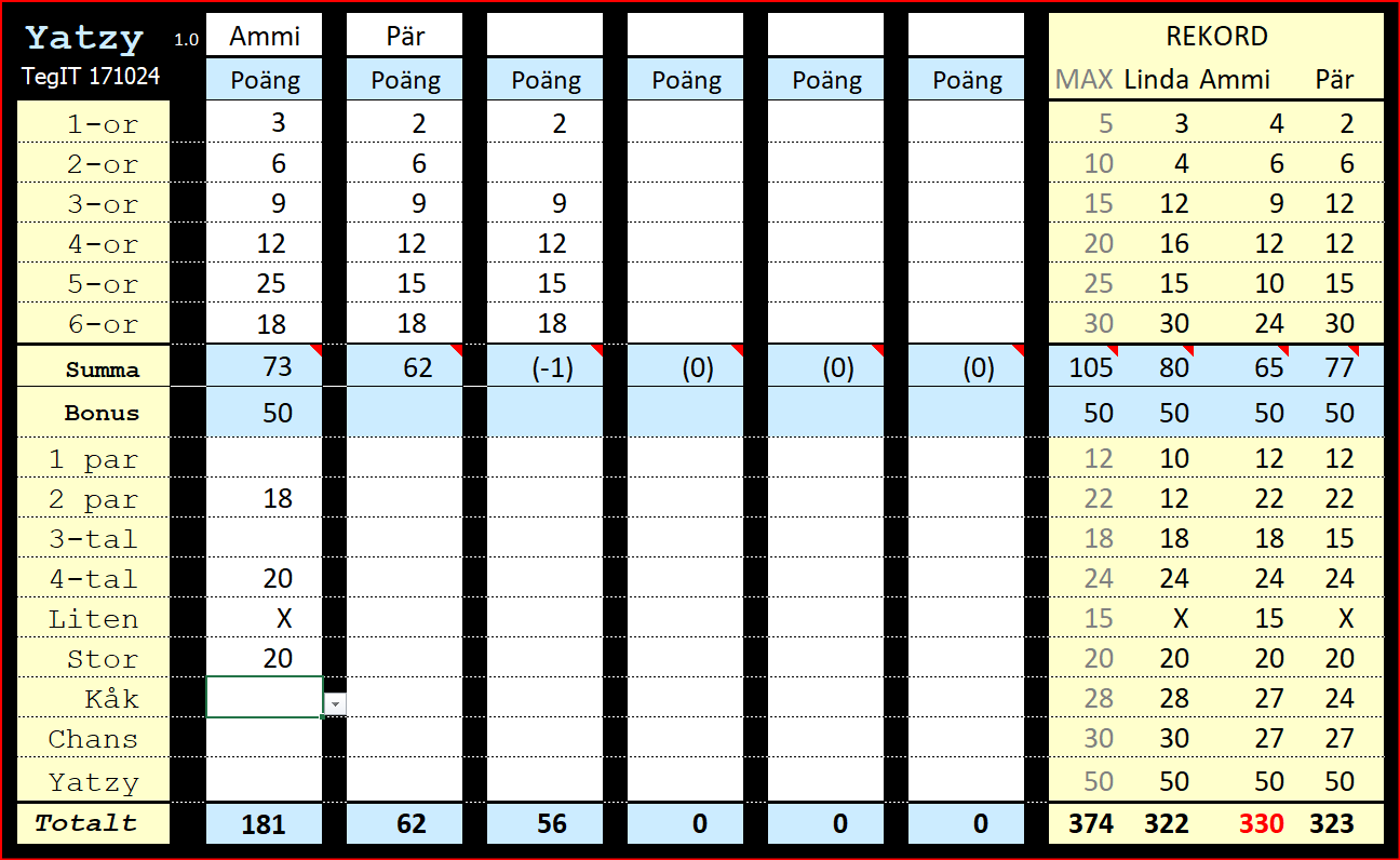 Excel arbetsbok som räknar poäng i Yatzyspel.